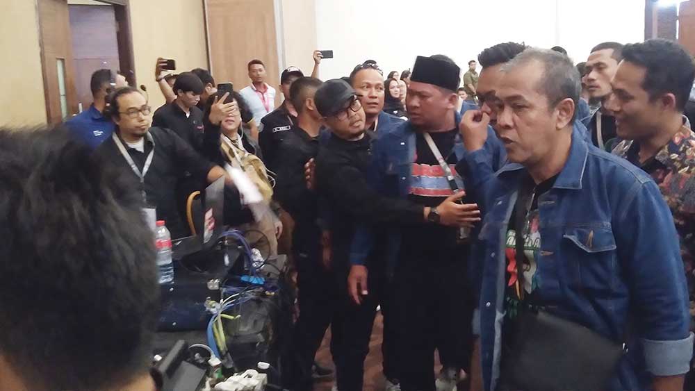 Ketegangan makin meningkat ketika para pendukung paslon 1 merangsek ke area panitia yang bertanggung jawab atas kontrol audio di bagian belakang venue.