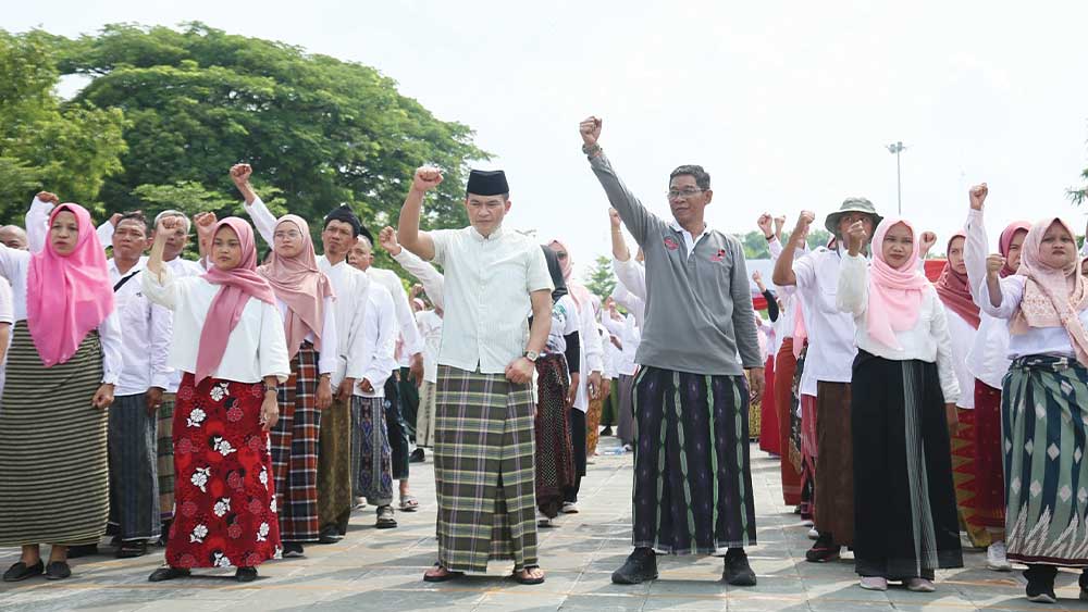 Pj Bupati Cirebon, Wahyu Mijaya mengenakan sarung tenun bersama ratusan ASN saat pemecahan rekor MURI penggunaan sarung tenun terbanyak di Indonesia, Jumat, 22 November 2024.* (Foto: Islah/Suara Cirebon)