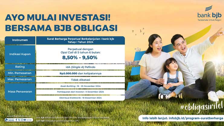 Masa penawaran awal untuk Surat Berharga Perpetual ini berlangsung pada 18-25 November 2024. Investor ritel maupun korporasi dapat berpartisipasi dengan minimum pemesanan sebesar Rp5 juta, tanpa batas maksimum. Sistem pemesanan dirancang mudah salah satunya melalui rekening efek yang terdaftar di bank bjb.