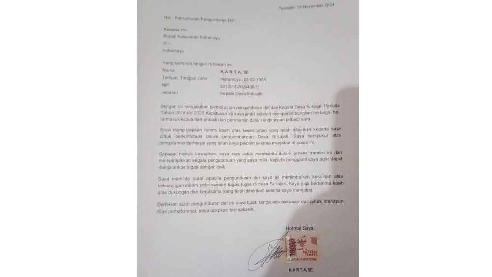 Karta mengundurkan diri sebagai Kepala desa Sukajati lewat surat tertulis yang diajukan ke Bupati Indramayu, Nina Agustina. Surat tertanggal 29 November 2024 lengkap dengan tanda tangan dan materi Rp.10.000.