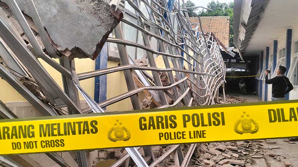 Garis polisi dipasang di lokasi ambruknya atap dua ruang kelas SMPN 1 Talun, Selasa, 10 Desember 2024.* (Foto: Dede Kurniawan/Suara Cirebon)