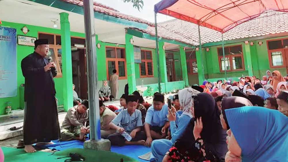 Kepala MI Miftahusibyan, Afidin (kanan) saat memberikan tausiyah di depan siswa-siswinya dalam peringatan Isra Mi’raj di madrasah setempat, Sabtu, 25 Januari 2025.* (Foto: Vicky/Suara Cirebon)