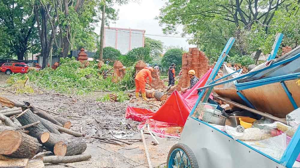 Gerobak milik pasutri yang hancur tertimpa pohon tumbang di depan Gedung Kesenian Rarasantang Komplek Stadion Bima, Kamis, 6 Februari 2025.* (Foto: Surya/Suara Cirebon)