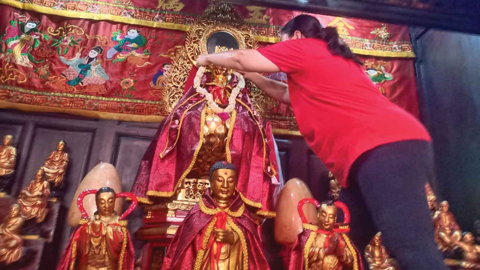 Seorang Pengurus Klenteng Dewi Welas Asih Cirebon sedang menggantungkan Bunga kepada Dewi Kwan Im Pho Sat. (Foto: Dokumen/Surya/Suara Cirebon)