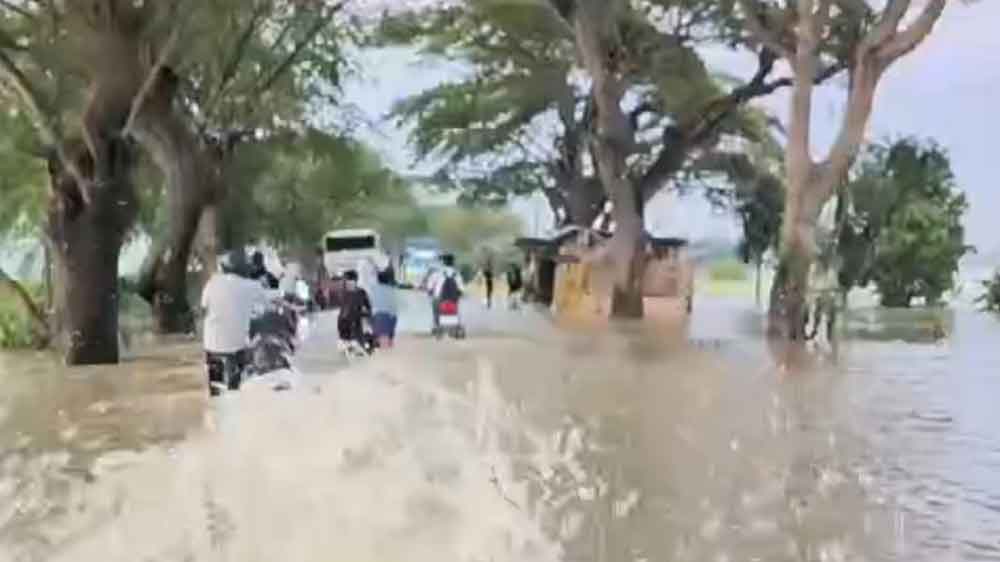 Banjir di Bayalangu Cirebon masih merendam ruas jalan Arjawinangun-Gegesik pada Selasa, 25 Februari 2025 pagi.* (Foto: Islah/Suara Cirebon)