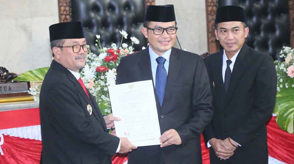 Serah terima jabatan dari Pj Bupati Cirebon, Wahyu Mijaya (tengah) kepada Bupati Cirebon definitif, Drs H Imron MAg (kiri) didampingi Wakil Bupati Cirebon, H Agus Kurniawan Budiman (kanan) bertempat di gedung DPRD Kabupaten Cirebon, Rabu, 5 Maret 2025.* (Foto: Islah/Suara Cirebon)