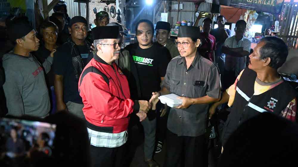 Bupati Cirebon, Drs H Imron MAg (jaket merah) saat membagikan makanan dalam acara Sahur On The Road bersama Forkopimda, Selasa, 11 Maret 2025.* (Foto: Islah/Suara Cirebon)