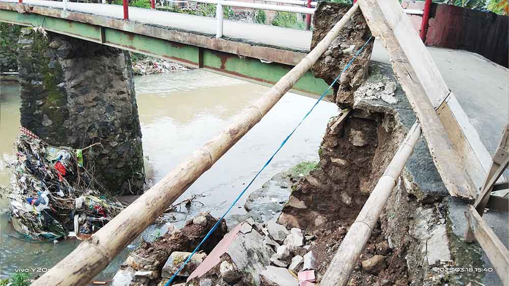 TPT Jembatan Gondang, di Blok Gondang Desa Batembat, Kecamatan Tengahtangi yang ambrol terkikis terjangan banjir, Rabu, 19 Maret 2025.* (Foto: Vicky/Suara Cirebon)