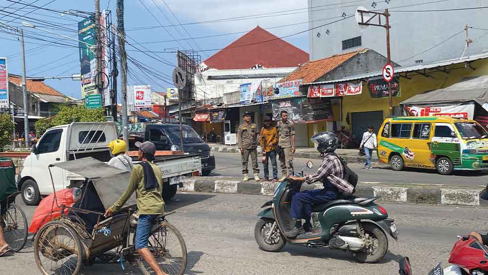 Petugas Satpol PP, Dinsos dan DPPKBP3A Kabupaten Cirebon saat razia pengemis, gelandangan, orang terlantar (PGOT) di salah satu lampu merah, Selasa, 15 April 2025.* (Foto: Islah/Suara Cirebon)
