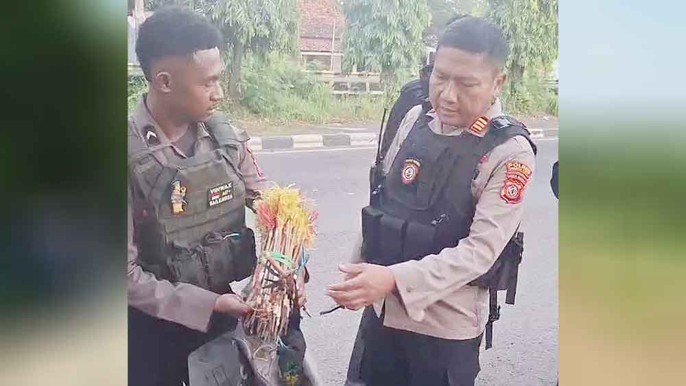 Anggota Polsek Gunungjati menunjukkan puluhan anak panah yang berhasil dikumpulkan sebagai barang bukti aksi tawuran di Desa Mertasinga, Kecamatan Gunungjati, Jumat, 25 April 2025.* (Foto: Vicky/Suara Cirebon)