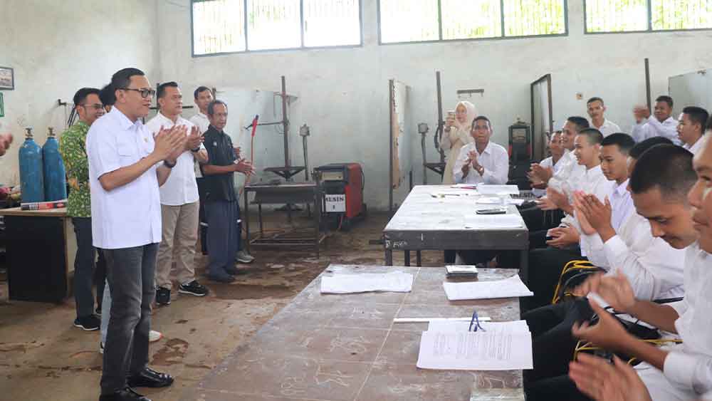 Menteri P2MI, Abdul Kadir Kariding saat kunjungan kerja ke UPTD Pelatihan Kerja Dinas Ketenagakerjaan Kabupaten Cirebon di Kecamatan Plumbon, pada Sabtu, 17 Mei 2025.* (Foto: Islah/Suara Cirebon)