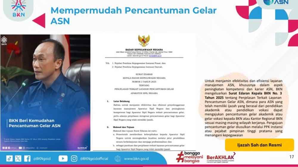 Ini merupakan tindak lanjut dari Surat Edaran Kepala BKN No. 3 Tahun 2025 tentang Penjelasan Terkait Layanan Pencantuman Gelar ASN, yang memberikan kesempatan kepada para ASN untuk mencantumkan gelar akademik atau vokasi dari ijazah yang diperoleh melalui pendidikan formal.