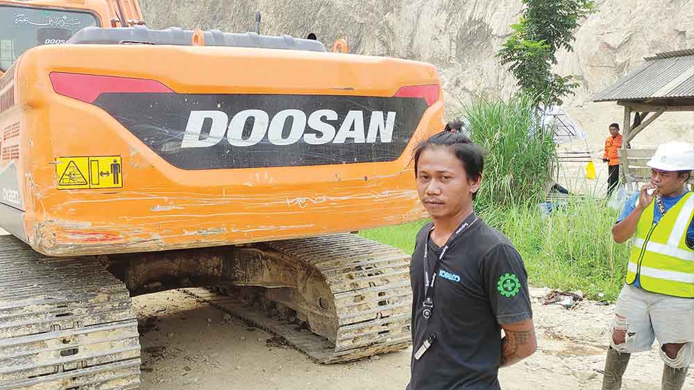 Rahmat, salah satu korban selamat musibah longsor tambang batu di Gunung Kuda, Desa Cipanas, Kecamatan Dukupuntang, Kabupaten Cirebon, di depan alat berat excavator yang dioperasikannya.* (Foto: Islah/Suara Cirebon)