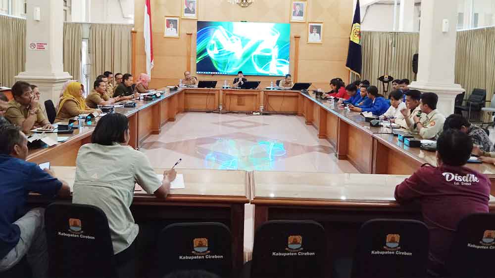 Audiensi mahasiswa GMNI, PMII dan BEM Universitas Muhammadiyah Cirebon (UMC) terkait 100 hari kerja Bupati Cirebon di ruang Paseban Setda, Kabupaten Cirebon, Selasa, 10 Juni 2025.* (Foto: Islah/Suara Cirebon)