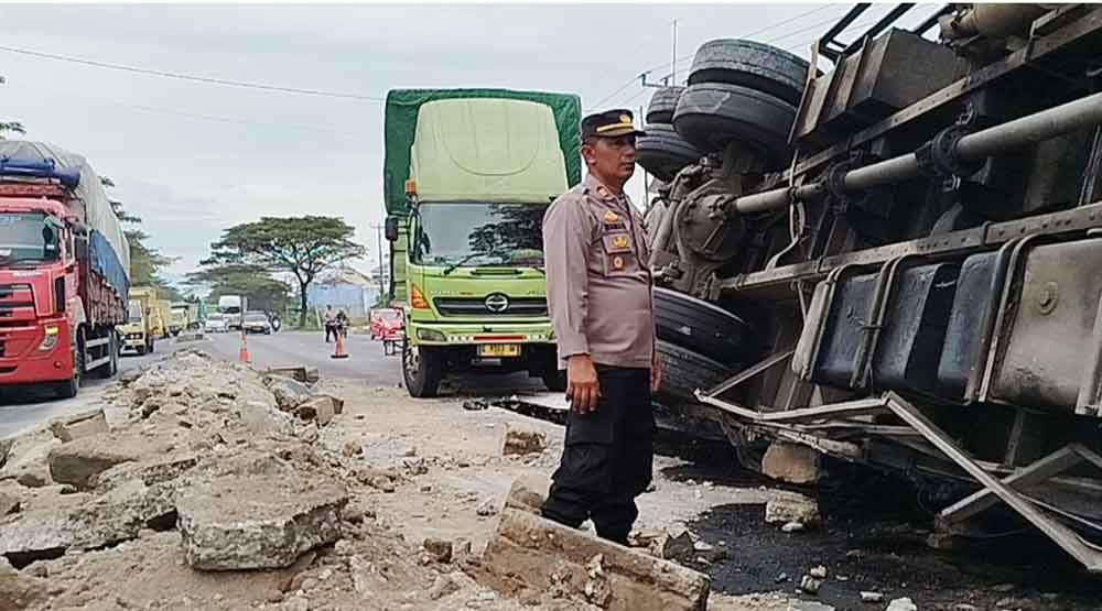 Karena kaget, pengemudi membanting stir kendaraan ke arah kanan dan menabrak beton pembatas jalan mengakibatkan mobil truk tersebut terguling.