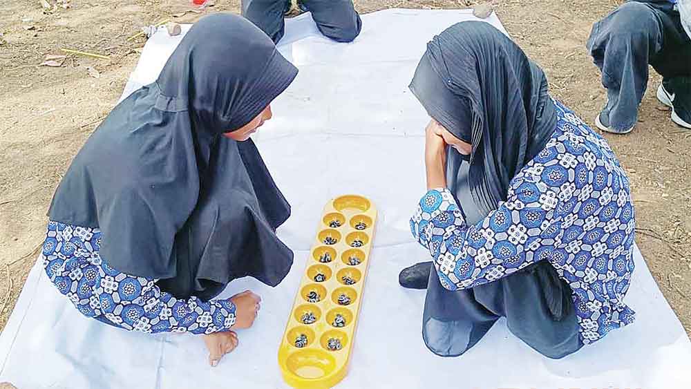 Dua murid SD tengah memainkan salah satu permainan tradisional congklak.* (Foto: Istimewa)
