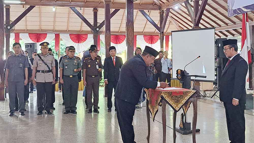 Sekretaris Daerah Kabupaten Cirebon, H Hendra Nirmala SSos MSi menandatangai berita acara pelantikan usai sumpah jabatan di hadapan Bupati Cirebon, Drs H Imron MAg, Rabu, 27 Agustus 2025.* (Foto: Islah/Suara Cirebon)