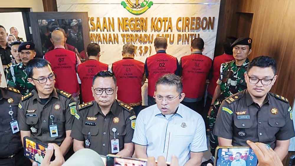Konferensi pers Kejari Kota Cirebon terkait penetapkan enam tersangka korupsi mega proyek pembangunan gedung Setda Kota Cirebon, Rabu, 27 Agustus 2025.* (Foto: Surya/Suara Cirebon)