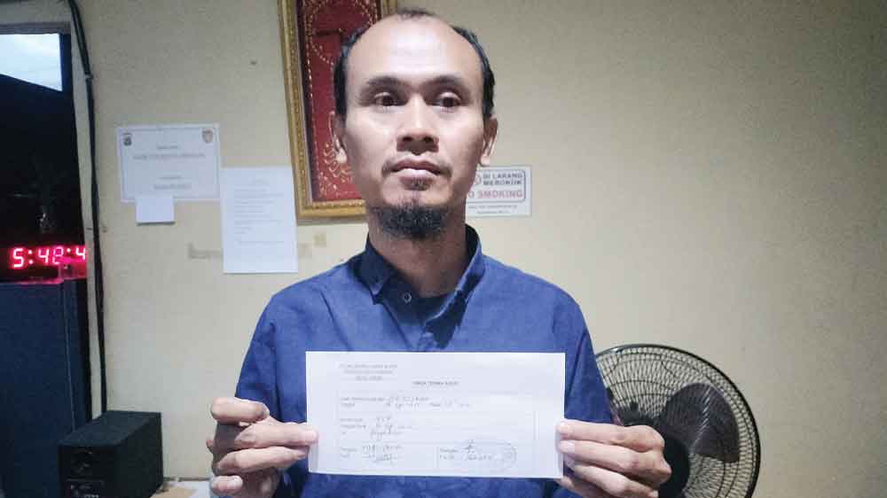 Heriayana menunjukkan tanda terima surat laporan kasus dugaan ijazah palsu dari Polresta Cirebon, Selasa, 9 September 2025.* (Foto: Vicky/Suara Cirebon)