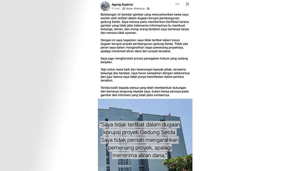“Belakangan ini beredar gambar yang mencantumkan nama saya seolah-olah terlibat kasus dugaan korupsi pembangunan gedung Setda. Saya merasa perlu memberikan klarifikasi karena gambar yang tidak jelas kebenaran informasinya itu membuat keluarga, teman, dan orang-orang terdekat saya bertanya-tanya dan merasa tidak nyaman,” tulis Agung membuka klarifikasi.