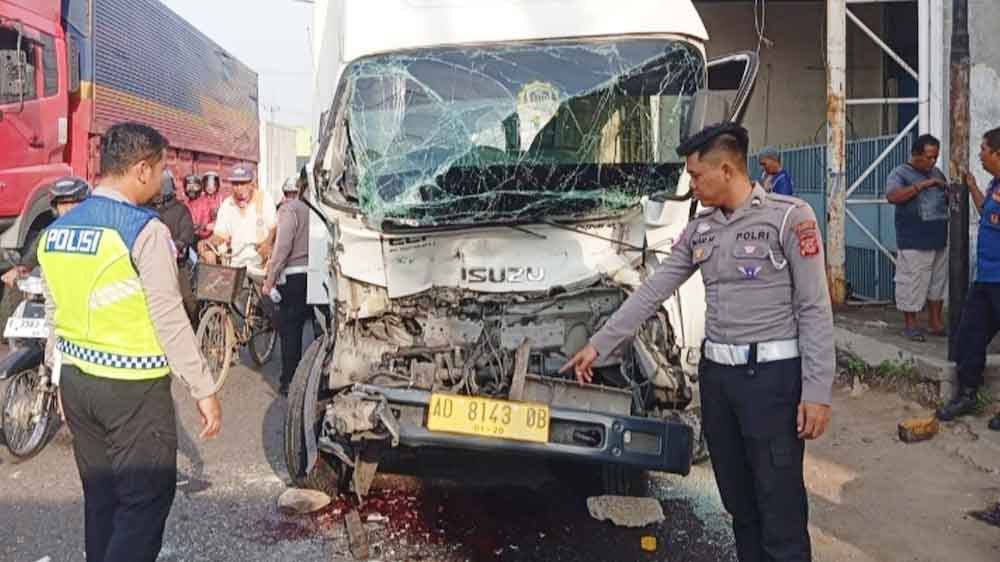 Anggota Satlantas Polresta Cirebon menunjukkan kondisi mobil boks yang menabrak truk tronton di depan Pasar Kue Weru (Plered), Sabtu, 13 September 2025.* (Foto: Vicky/Suara Cirebon)