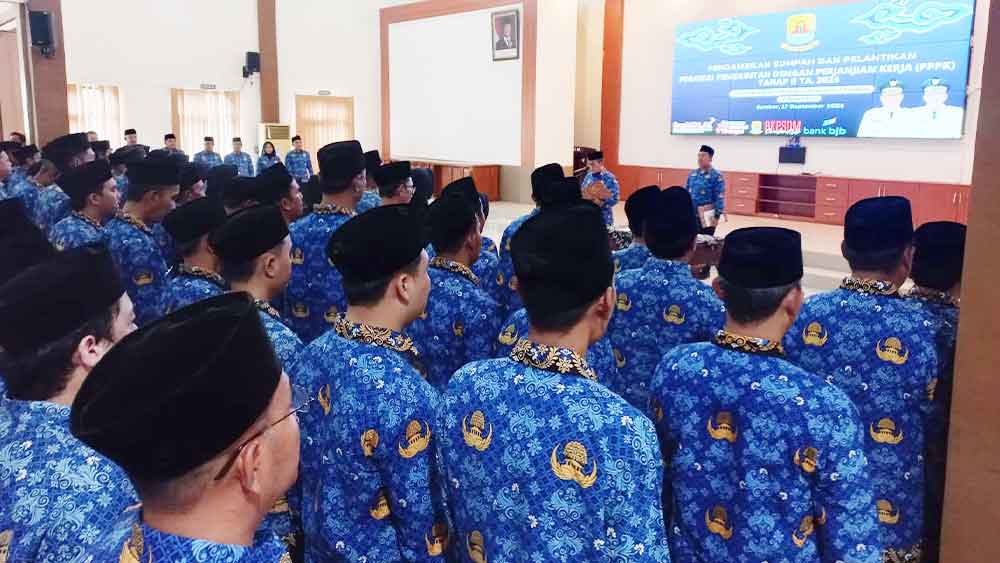Prosesi pelantikan 290 tenaga honorer menjadi PPPK di Aula Cakrabuana Kantor BKPSDM Kabupaten Cirebon, Rabu, 17 September 2025.* (Foto: Islah/Suara Cirebon)