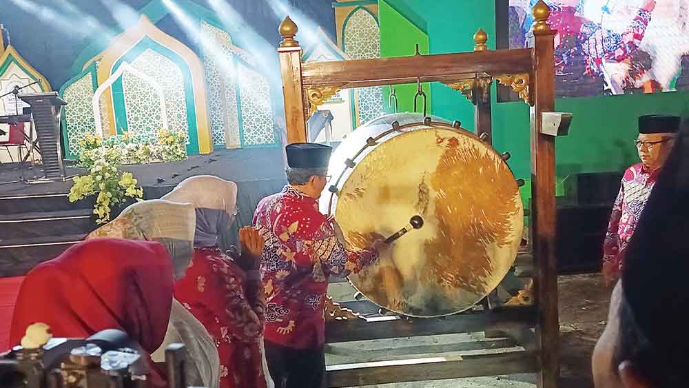 Bupati Cirebon, H Imron memukul begud tanda dimulainya MTQH ke‎-51 tingkat Kabupaten Cirebon, di Gedung Islamic Centre, Kecamatan Kedawung, Selasa, 25 November 2025 malam.* (Foto: Vicky/Suara Cirebon)