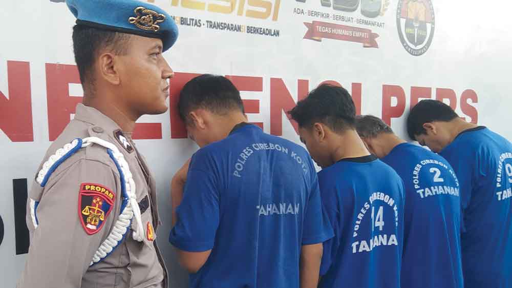 Empat tersangka pembobol ATM modus ganjal dihadirkan saat konferensi pers di Mapolres Cirebon Kota, Rabu, 10 Desember 2025.* (Foto: Sukirno/Suara Cirebon)