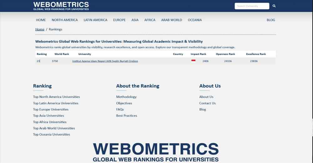 Berdasarkan data resmi Webometrics, UIN Siber Syekh Nurjati Cirebon juga tercatat berada pada peringkat 3.750 dunia. Capaian tersebut menegaskan posisi UIN Siber Syekh Nurjati Cirebon sebagai salah satu PTKIN yang konsisten mengembangkan pendidikan tinggi Islam berbasis teknologi digital.